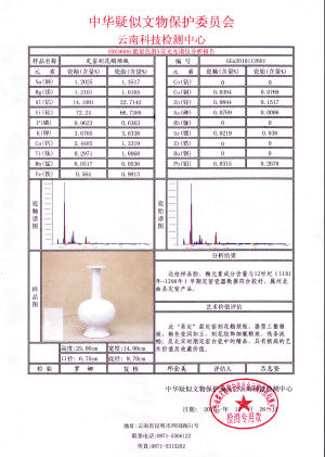 中心呂志堅(jiān)主任補(bǔ)充說(shuō),定窯是我國(guó)北方最著名的白瓷窯之一,在中國(guó)陶瓷史上占有重要地位,它始創(chuàng)于唐而終于元,燒造歷史達(dá)六、七百年之久。定窯白瓷制作精工,造型優(yōu)美,胎色潔白細(xì)膩,瓷化程度很高。市售很多定窯白瓷仿制品為達(dá)到古籍中描述的“胎薄透影”,在瓷土中摻入大量鋯元素來(lái)使胎質(zhì)堅(jiān)硬。張先生的鵝頸瓶胎質(zhì)細(xì)膩堅(jiān)硬,EDX3600L― X熒光光譜儀的檢測(cè)數(shù)據(jù)顯示,瓷胎中鋁元素的含量在20%以上,鋯元素含量為零,說(shuō)明胎的瓷化程度很高,是傳世定窯白瓷中的精品。