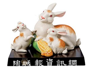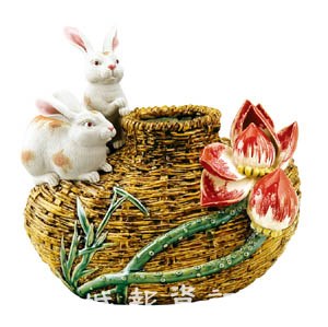 池塘邊放著一只小魚簍,微風(fēng)吹來兩支荷花靠在了魚簍上,兩只小白兔調(diào)皮地爬到魚簍上好奇地張望著。楊慶焜告訴記者,《百業(yè)興旺》的構(gòu)思就來源于他曾經(jīng)在荷塘邊看到的這一幕。作為今年限量版生肖品中唯一一個(gè)器皿,《百業(yè)興旺》把實(shí)用性和裝飾性相結(jié)合,作品構(gòu)圖錯(cuò)落有致,荷花與小兔又左右平衡,相互呼應(yīng),形成一幅頗具鄉(xiāng)土風(fēng)味的水彩畫,如果在“魚簍”上插上幾支荷花,整體效果會(huì)更加美妙。楊慶焜表示:“作品的創(chuàng)意來源現(xiàn)實(shí)又要高于現(xiàn)實(shí),大自然是我創(chuàng)作的老師。”為了獲得更多創(chuàng)作的靈感和素材,他還經(jīng)常出外寫生,體驗(yàn)生活。