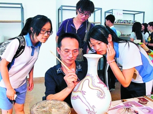 自2008年底深圳被冠以“設(shè)計(jì)之都”稱號之后,新增的創(chuàng)意產(chǎn)業(yè)園就有深圳設(shè)計(jì)產(chǎn)業(yè)園、深圳動漫園、梅沙原創(chuàng)音樂前沿基地、中國絲綢文化產(chǎn)業(yè)園、深圳陶瓷文化產(chǎn)業(yè)園等。 圖為香港和龍崗兩地大學(xué)生近期在深圳陶瓷文化產(chǎn)業(yè)園內(nèi)參觀陶瓷制作工藝!