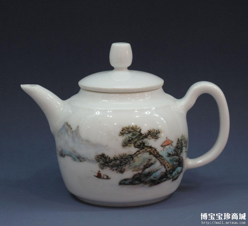 圖中展示的這件來自于博寶寶珍商城的粉彩山水壺也是王桂英女士的作品,作品既有文雅氣韻,勁秀有力,又形神俱到,意境深遠(yuǎn),胎質(zhì)細(xì)膩,胎底色為潔白如玉,純凈無暇,線條滑潤流暢,構(gòu)圖簡潔明了,意境寧靜高遠(yuǎn)。這件粉彩山水壺是不可多得的當(dāng)代瓷器藝術(shù)佳作,非常值得收藏觀賞,體現(xiàn)悠悠意境。(博寶藝術(shù)評(píng)論員 孫瑞峰 撰文)
