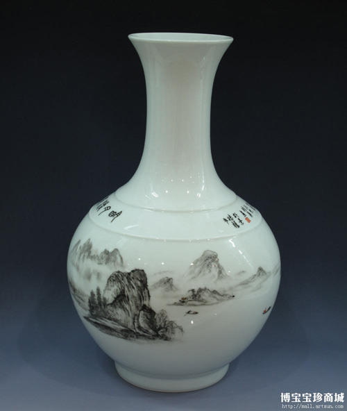 汪桂英女士的陶瓷藝術(shù)品,既有父親的遺風(fēng),又有個(gè)人特色,廣泛采用水畫名家名畫的畫風(fēng)畫技,意境寧靜高遠(yuǎn),古韻與新意俱佳。圖中展示的這件墨彩瓶《唐詩詩意圖》便是出自汪桂英女士之手,收藏于博寶寶珍商城,陶瓷造型上極其精巧,新穎獨(dú)特極富現(xiàn)代美,工筆寫意更是意蘊(yùn)悠長,具有傳統(tǒng)水墨的詩性魅力,山水重巒疊嶂,作品具有女性細(xì)膩雅致的獨(dú)特氛圍,更是具有極高的收藏價(jià)值和審美情趣。