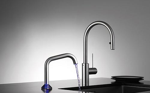 它的控制方法非常簡單,點擊一次,出冷水(藍色),兩次暖水(橙),三次熱水(紅)。內(nèi)置的LED燈讓水流呈現(xiàn)不同的顏色,提示你水的溫度。10秒后,水會自動關(guān)閉。這款水龍頭還具有清潔模式,可以自動進行清潔,只要通過較長的觸摸激活它即可。