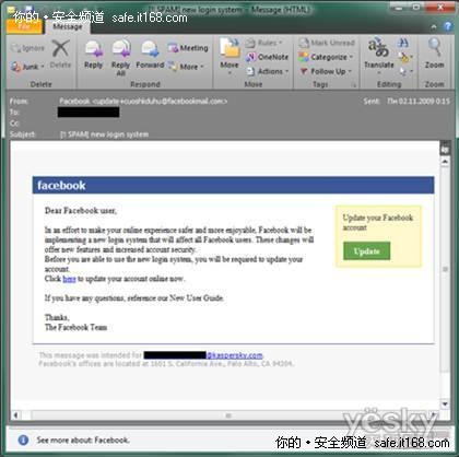 當(dāng)然,也有些偽造的社交網(wǎng)站的提示郵件并不會要求用戶輸入用戶名和密碼,并且這些郵件看上去除了其中的鏈接外,其他均同真實的郵件100%相似。但是如果用戶仔細看一下其中鏈接的地址,就會看到其將用戶定向到的地址并非該社交網(wǎng)站的官方地址。網(wǎng)絡(luò)詐騙者經(jīng)常將這些假冒的詐騙網(wǎng)站做得同真實網(wǎng)站非常相似,如假冒的網(wǎng)站會使用http://fasebook.com/,而真實的地址則是http://facebook.com/。