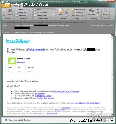 社交網(wǎng)絡(luò)現(xiàn)在愈加流行,很多人都有Facebook、Twitter等等社交網(wǎng)站的賬號。有時,我們會在其中發(fā)現(xiàn)一些假冒的提醒郵件,而這些假冒郵件的目的是竊取用戶的個人數(shù)據(jù),獲取對用戶社交網(wǎng)絡(luò)賬號的訪問權(quán),這與針對銀行的釣魚詐騙非常相似。首先用戶會收到一封自稱是來自某個社交網(wǎng)站的提醒郵件,郵件中聲稱有人給你留言或者希望加你為好友,或者你需要更新賬戶信息。如果你點擊其中的鏈接,將會被引導(dǎo)到一個假冒的網(wǎng)站,用戶如果在此網(wǎng)站輸入了用戶名和密碼,就會被發(fā)送給網(wǎng)絡(luò)詐騙者。