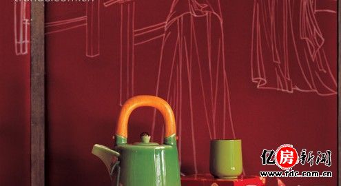 竹節(jié)手柄配合清新的綠色茶壺,在紅色背景襯托下,讓東方的釉色更顯清爽自然。