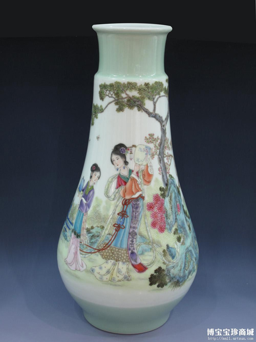 陶瓷藝術(shù)不僅僅是物質(zhì)產(chǎn)品,而且是一種文化產(chǎn)品,更是一種精神產(chǎn)品。圖中展示的這件豆青釉瓷瓶《人物游園品茶》是由景德鎮(zhèn)陶瓷名家鄒寶林所作,收藏于博寶寶珍商城。這件瓷瓶造型獨特,淡雅柔和,色淺處淡若湖水,淡雅釉色襯托下的色彩,使瓷瓶顯得更加艷麗嫵媚,瓷瓶上的女子端莊典雅,可謂是將繪畫與陶瓷藝術(shù)完美的結(jié)合。鄒寶林是景德鎮(zhèn)瓷器制作的代表人物,擅長粉彩人物瓷畫,兼長圖案、翎毛、山水瓷畫,作品構(gòu)思嚴謹、形式多樣、設(shè)色濃艷,作品具有很強的藝術(shù)觀賞性。