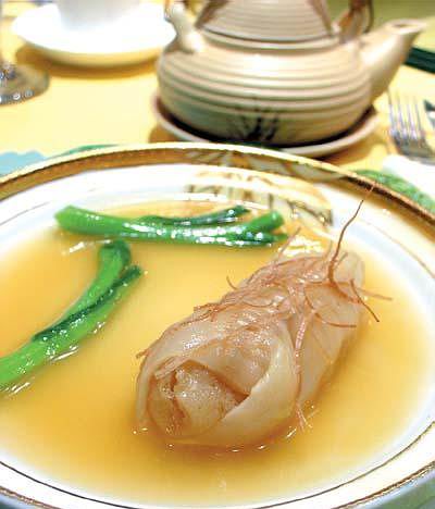 雞湯花膠筒則是此類的佼佼者。客人吃到的首先是碟上的一只花膠筒,花膠筒經(jīng)過燉、煨的步驟,并淋上濃雞湯芡汁,客人需用刀叉進(jìn)食。食畢,再喝茶壺雞湯,一茶杯的湯喝進(jìn)口,雞湯的清甜頓時把之前花膠的油膩洗去,清爽滋味。不同的是,這茶壺湯只是個形式,湯是后來加入已經(jīng)預(yù)熱準(zhǔn)備好的茶壺中,并不是用這個茶壺一起煲出來的。