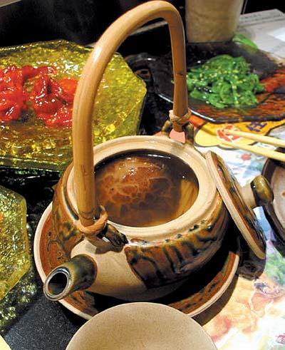 傳統(tǒng)日本料理中也有茶壺湯,用的是陶質(zhì)茶壺,壺頂上也倒扣著一個茶盅,內(nèi)容則以菇、海鮮、蔬菜和高湯為主,大同小異。一茶壺有3、4杯湯,極其鮮美。喝湯的同時還可以吃掉壺中的材料,一舉兩得。