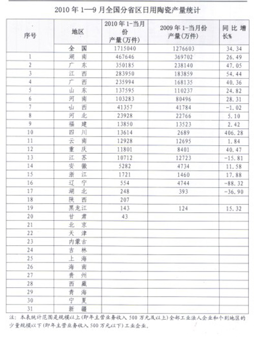 2010年1—9月全國(guó)分省區(qū)日用陶瓷產(chǎn)量統(tǒng)計(jì)