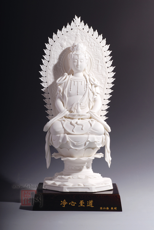 陳仁海大師的《凈心至道》作品,選材之精、工序之繁、技藝之難、工藝之精,均體現(xiàn)了德化佛瓷“華縟之極,無上之品”的風(fēng)范,代表了德化當(dāng)代佛瓷的至高水準(zhǔn)。瓷質(zhì)細(xì)、白、光潤(rùn)通透,扎道紋飾精細(xì)華麗。觀音形狀端莊,寧靜秀麗,姿態(tài)溫婉動(dòng)人,神態(tài)超凡脫俗,給人以慈悲親切的感覺。