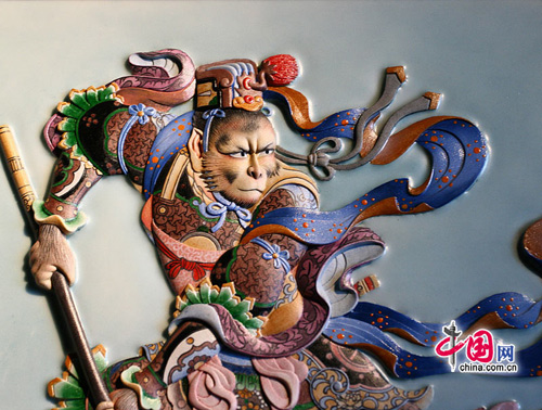 中國收藏2010十大藝術(shù)陶瓷名品展上的精美作品。瓷板畫-《齊天大圣》局部(博夢堂 攝影報道)