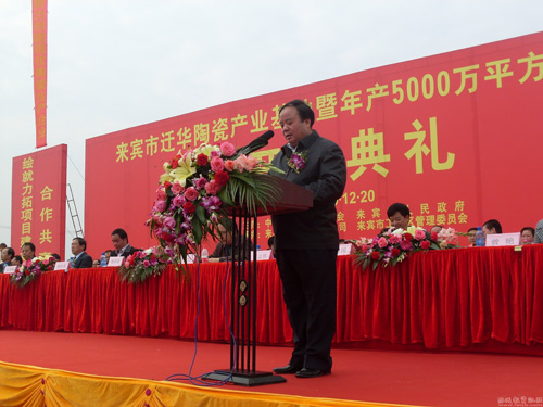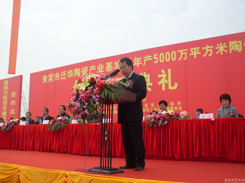 廣西新中陶陶瓷有限公司總經(jīng)理龐景成在致辭中指出,新中陶把投資的目光對(duì)準(zhǔn)了八桂大地的中心地帶——來(lái)賓,并在最短的時(shí)間內(nèi)落戶遷華陶瓷產(chǎn)業(yè)園,緣于這里具有其它地方不可比擬的優(yōu)勢(shì):一是遷華工業(yè)園擁有大量的土地儲(chǔ)備;二是發(fā)展陶瓷產(chǎn)業(yè)的優(yōu)勢(shì)明顯,來(lái)賓除了擁有豐富的陶瓷原料和人力資源外,最重要的是電能豐富,每年都有較大的富余電量等待企業(yè)使用;三是符合未來(lái)陶瓷產(chǎn)業(yè)的發(fā)展,雖然來(lái)賓的交通物流尚不能夠使這里的陶瓷產(chǎn)品輻射到全國(guó)市場(chǎng),但可輻射到東盟各國(guó);四是良好的政務(wù)環(huán)境。