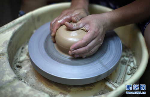 在鶯歌鎮(zhèn)的一個陶藝工作室里,制陶師傅蔡青峰在拉坯。