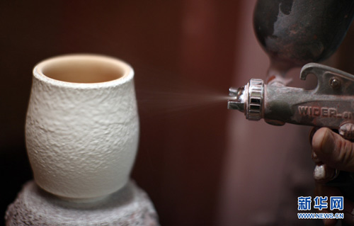 在鶯歌鎮(zhèn)的一個陶藝工作室里,制陶師傅蔡青峰在給陶坯上釉。