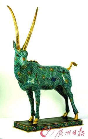 清代銅胎掐絲琺瑯寶絲花紋公羊:羊首神氣活現(xiàn)、身軀肌理豐腴,兩角尖銳仰上,并刻上螺絲狀紋。羊首、羊身、四足為翠藍(lán)色,順著動(dòng)物身上繪有披毛及花紋,細(xì)膩動(dòng)人。雙角、背上披毛、尾巴皆鍍金,腳踏金蹄,公羊線條優(yōu)美,姿勢(shì)優(yōu)雅矯健,形神兼?zhèn),為難得一見的獸型掐絲琺瑯稀世奇珍,估值達(dá)二百多萬港元。