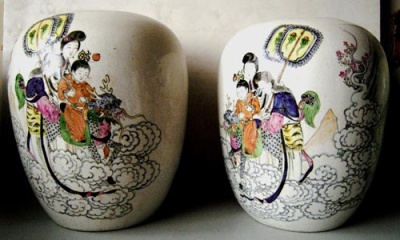 這是一對底款為啟新瓷廠、詩款為庚午年(1930年)的人物罐。畫面飽滿,色彩豐富。瑞獸雄壯,給人以安全感。人物端莊大方,體現(xiàn)出中國古代的安祥之美。祥云、山巒、花樹、莆扇俱全,色彩多而不亂。背詩為五言絕句,顏骨魏風(fēng),壯而不肥,內(nèi)容顯示出新文化的氣息。