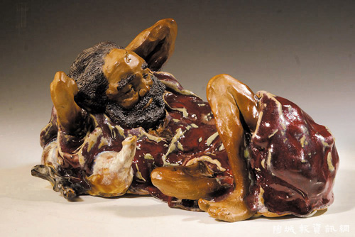 就是只是“慈眉睡眼迷離”與“巨眼”有所不同這一點(diǎn),就顯示出劉藕生大師的藝術(shù)功力到家。鐵拐李是個(gè)貌丑心善的神仙,陶塑家用陶泥加彩釉將一個(gè)貌丑心善的神仙,塑造出一個(gè)人們樂見的美的藝術(shù)形象是一件不容易的亊。鐵拐李只是貌丑。丑不等于丑陋,丑是難看的意思;丑陋除了有難看的意思外,還含有不文明、不道德之意。有句俗話“一美遮百丑”。劉藕生大師的一招“慈眉睡眼迷離”,這“心靈之窗”就突現(xiàn)了鐵拐李的美!惰F拐李倚葫蘆》的欣賞者,看到了雙手當(dāng)枕、倚葫蘆臥鐵拐杖、慈眉睡眼迷離的鐵拐李,頗會(huì)浮想聯(lián)翩:可能聯(lián)想到鐵拐李用仙丹剛治癒一群痼疾患者,在小憩里又想著如何去診治另一群痼疾患者;也可能聯(lián)想到鐵拐李剛賑濟(jì)完一群饑寒交迫的災(zāi)民,在小憩里又想著如何去賑濟(jì)另一群饑寒交迫的災(zāi)民……這可以說這件陶藝作品的人物形象神備。