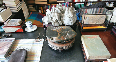 王靖憲的夫人忙著給我們倒茶,指著塞滿了書籍、石頭、陶瓷的客廳笑著說:“你們看,家里有空兒的地方都被他給占了。”從她的語氣和眼神里,可以明顯感覺到她對王老的這些“寶貝”也是極為疼愛。