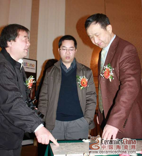 (中國建筑衛(wèi)生陶瓷協(xié)會會長葉向陽(右)在廣東金牌陶瓷有限公司生產(chǎn)總經(jīng)理梁志啟(中)的陪同下鑒賞新品.)