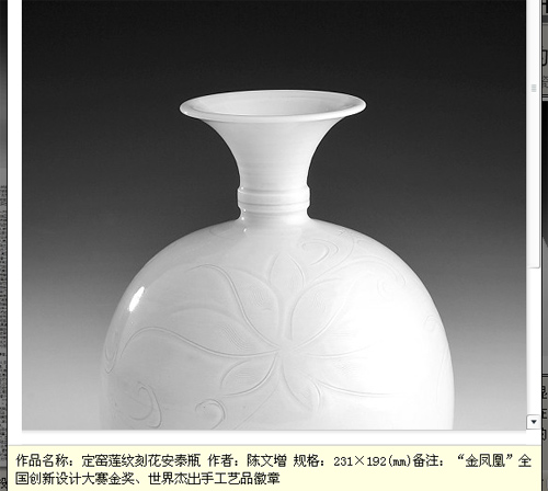 陳文增從事定窯研究30余年,為恢復(fù)、傳承定窯這一中華民族瑰寶殫精竭慮,歷盡艱難,終于使失傳千年之久的歷史名窯再現(xiàn)人間。他總結(jié)出定窯特有的“形、聲、色”風(fēng)格特點(diǎn),確立了科學(xué)的定窯泥料制備方法及傳統(tǒng)拉坯工藝操作規(guī)程和技術(shù)要求,制定了科學(xué)的燒成曲線和規(guī)范的燒成制度,發(fā)明了定瓷刻花專用刀具——— 單線刀、雙線刀、組線刀,打破了陶瓷史上關(guān)于定瓷雙線紋樣“刻一刀,復(fù)一刀”的說(shuō)法,并形成“刀行形外,以線托形”的經(jīng)典刻花理論,被香港《大公報(bào)》譽(yù)為“比宋時(shí)有過(guò)之而無(wú)不及”;制定了定窯“古、新、奇”發(fā)展戰(zhàn)略,形成藝術(shù)、仿古、日用、名人作品四大系列、百余品種的定瓷生產(chǎn)規(guī)模;成功申請(qǐng)“定瓷傳統(tǒng)燒制技藝”入選國(guó)家級(jí)非物質(zhì)文化遺產(chǎn)名錄;自創(chuàng)“瓷、詩(shī)、書三聯(lián)藝術(shù)”入選大世界基尼斯之最;以“光中華之絕技,創(chuàng)定窯之全新”為歷史使命,建立了定瓷生產(chǎn)性保護(hù)機(jī)制、大師授徒傳承機(jī)制和文化型大師創(chuàng)作隊(duì)伍的人才培養(yǎng)模式,為定瓷的傳承保護(hù)打下了堅(jiān)實(shí)的人文基礎(chǔ)。