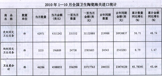2010年1—10月全國衛(wèi)生陶瓷海關(guān)進口統(tǒng)計