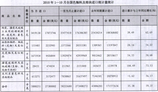 2010年1—10月全國色釉料及熔塊進(jìn)口統(tǒng)計(jì)量統(tǒng)計(jì)