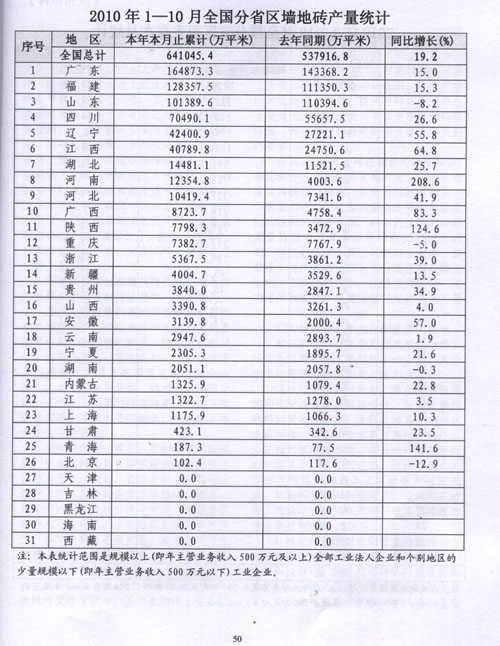 2010年1—10月全國(guó)分省區(qū)墻地磚產(chǎn)量統(tǒng)計(jì)