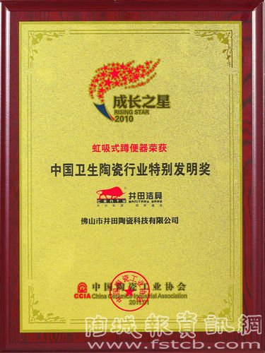 井田潔具又傳佳音,“虹吸式蹲便器”再獲殊榮。2011年1月14日,佛山市井田陶瓷科技有限公司被中國陶瓷工業(yè)協(xié)會授予 “中國衛(wèi)生陶瓷行業(yè)特別發(fā)明獎”,榮獲行業(yè)頂級獎項。得獎產(chǎn)品“虹吸式蹲便器”是井田的“發(fā)明專利產(chǎn)品”、“明星產(chǎn)品”,素有“天下第一蹲”的美譽。