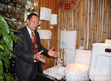 井田潔具總經(jīng)理、“虹吸式蹲便器”發(fā)明者陳小練先生正在講解獲獎產(chǎn)品。
