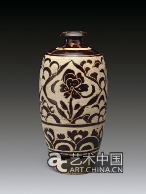 2002年紐約佳士得春拍,高22.9厘米的北宋刻花梅瓶估5萬至7萬美元,以16.55萬美元拍出,梅身刻繪兩枝折枝花卉紋,先施黑彩后刻繪,采用這種裝飾手法的器物同場(chǎng)上還以3.525萬美元拍出一件北宋的雙耳罐。這類梅瓶的器型有別于常見梅瓶,為矮腹型,有矮腹梅瓶之稱,與長(zhǎng)身型梅瓶最大的區(qū)別僅在于瓶身僅取長(zhǎng)身梅瓶的上半部分,造型圓潤(rùn)豐滿,存世數(shù)量不多。邯鄲、磁縣地區(qū)的博物館中藏有白釉褐彩、白釉黑彩和綠釉黑彩等品種。2003年倫敦蘇富比秋拍以1.8萬英鎊拍出一件金代制品,高19厘米,畫意較北宋刻花梅瓶更加寫意豪放,梅瓶瓶口及頸部滿飾黑釉,古樸典雅。2006年紐約蘇富比秋拍,以10.8萬美元拍出一件類似風(fēng)格的宋代梅瓶,高21.5厘米。10月26日,筆者在磁縣中國(guó)磁州窯博物館“首屆磁州窯論壇特展”上見有一件與上述風(fēng)格類似的展品,不同的是,展品腹部除折枝花卉外,尚繪有4只飛舞的蜜蜂。今年12月1日,香港佳士得將上拍一件高22.9厘米的北宋/金代白地褐花小口瓶,亦屬同類風(fēng)格,估30萬至40萬港幣。