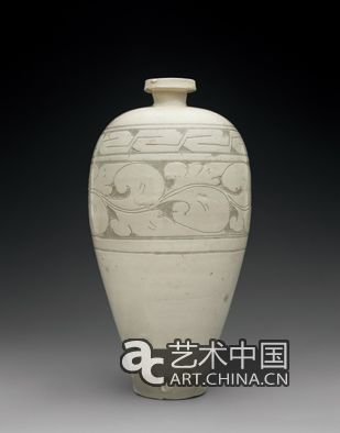 磁州窯的化妝白釉瓷種類繁多,宋代制品胎體精巧輕薄,金、元時(shí)期體型敦厚,曾是磁州窯早期白瓷的主流品種。拍場(chǎng)上這類傳世的完整器物少,2004年倫敦蘇富比春拍以7.2萬英鎊拍出的北宋白釉花觚可謂代表作品,高31厘米,器型古樸典雅,除近足處以高撇足外,通體瑩潤(rùn)的白釉,白釉泛黃,海內(nèi)外博物館收藏的同類完整器物僅在個(gè)位數(shù)。2009年紐約佳士得春拍,Walter Hochstader舊藏的宋代白釉刻花紋盤口瓶以19.45萬美元拍出,此瓶1986年曾由該公司春拍拍出,瓶高39.6厘米,盤口長(zhǎng)頸,肩及足部刻圓形大瓣覆、仰蓮瓣紋,腹部刻大花大葉的纏枝花卉紋,風(fēng)格豪放,具有浮雕感,知所同時(shí)代的同類盤口瓶在美國(guó)華盛頓、印第安那州藏有2件。