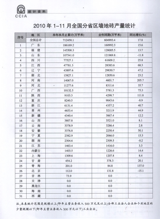 2010年1-11月份全國分省區(qū)墻地磚產(chǎn)量統(tǒng)計(jì)