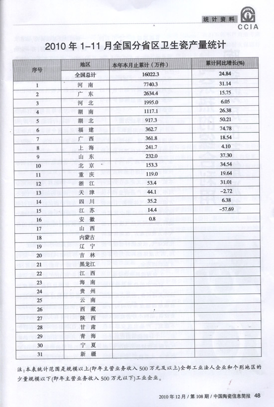 2010年1-11月份全國分省區(qū)衛(wèi)生瓷產(chǎn)量統(tǒng)計(jì)