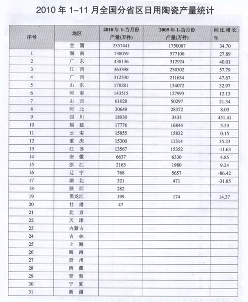 2010年1-11月份全國(guó)分省區(qū)日用陶瓷產(chǎn)量統(tǒng)計(jì)