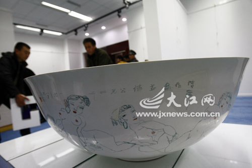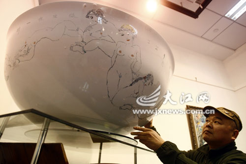 昨日下午,方衛(wèi)國(guó)作品運(yùn)抵江南藝術(shù)館,其中包括這個(gè)備受矚目的吉尼斯薄胎碗。方衛(wèi)國(guó)告訴記者,這個(gè)薄胎碗是他2008年購(gòu)買(mǎi)的,碗口寬為1.26米,創(chuàng)下了當(dāng)時(shí)的吉尼斯最大薄胎碗紀(jì)錄。買(mǎi)來(lái)后,方衛(wèi)國(guó)邀請(qǐng)了著名的老藝術(shù)家陳醉在薄胎碗上作畫(huà),繪畫(huà)了17個(gè)沐浴中的婀娜少女。因?yàn)槭潜√ネ,陳醉進(jìn)行的是釉上彩創(chuàng)作,價(jià)值600萬(wàn)元人民幣。陳醉,曾在江西工作過(guò)很長(zhǎng)時(shí)間,現(xiàn)任中國(guó)藝術(shù)研究院美術(shù)研究所研究員、教授、博士生導(dǎo)師,中國(guó)裸體藝術(shù)研究專(zhuān)家。早在上個(gè)世紀(jì)80年代,他就潛心于當(dāng)時(shí)還是“禁區(qū)”的裸體藝術(shù)的研究。代表作《裸體藝術(shù)論》為我國(guó)第一部有關(guān)的學(xué)術(shù)專(zhuān)著,有關(guān)學(xué)者對(duì)專(zhuān)著予以高度肯定與贊揚(yáng),認(rèn)為是具有“填補(bǔ)空白”、開(kāi)拓領(lǐng)域的里程碑意義的研究成果,在中國(guó)現(xiàn)代美術(shù)史及至文化史上都具有特殊意義。