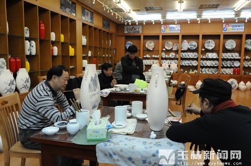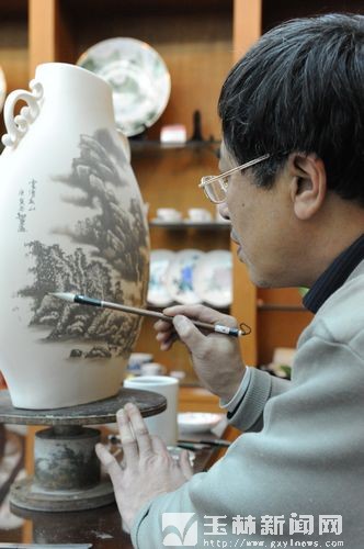 構(gòu)思、凝神、運(yùn)筆……潔白的瓷瓶上很快便有了生氣。不久,一幅賞心悅目的畫圖便躍然而出,與精美的瓷器相得益彰。