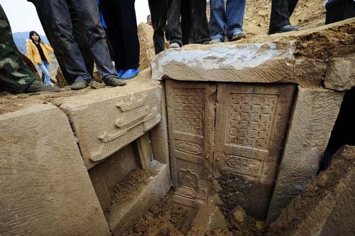 據(jù)悉,三座古墓的墓門很奇特:外形似現(xiàn)在的雙開(kāi)門冰箱門,每扇高1.2米、寬四五十厘米,雕刻圖案是窗欞等浮雕。需補(bǔ)充的是,雙開(kāi)的墓門上,還垂著金屬門環(huán)。