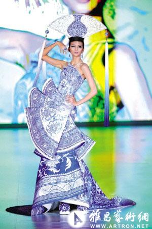 2010香港時(shí)裝周,郭培的高級(jí)定制系列青花瓷晚裝更是令人驚艷:一件青花瓷魚(yú)尾禮服,且不說(shuō)通身的青花刺繡,模特的頭上頂?shù)氖莻(gè)鑲滿(mǎn)了水晶的青花瓷瓶,腳上踏的也是兩只青花瓷高屐,耳環(huán)、戒指無(wú)一不是青花瓷,甚至連指甲上都密密地畫(huà)上了青花圖案。