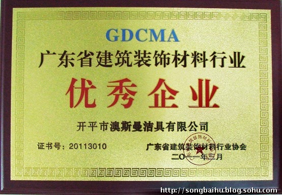 根據(jù)《關于廣東省建筑裝飾材料行業(yè)科技創(chuàng)新獎推介評審辦法》和《關于廣東省建筑裝飾材料行業(yè)推廣應用產(chǎn)品推介評審實施辦法》的要求,廣東省建筑裝飾材料行業(yè)協(xié)會專家組成員按照《廣東省建筑裝飾材料行業(yè)協(xié)會專家組工作規(guī)則》的原則,對在2010年廣東省建筑裝飾材料行業(yè)中節(jié)能減排、低碳環(huán)保的企業(yè)進行“公正、公平、公開”的評選,對為行業(yè)“節(jié)能減排”發(fā)展做出突出貢獻的優(yōu)秀企業(yè)給予了隆重表彰,澳斯曼潔具獲得2010年“廣東省建筑裝飾材料優(yōu)秀企業(yè)”的稱號。