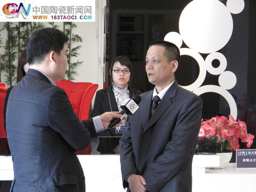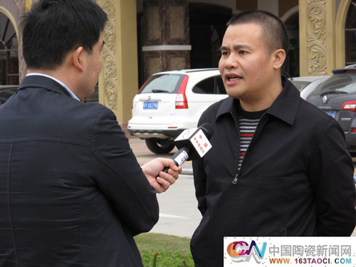 3月17日,中央電視臺新聞中心首席記者在中國陶瓷產(chǎn)業(yè)總部基地采訪藍衛(wèi)兵主任 (吳樂凱 攝)