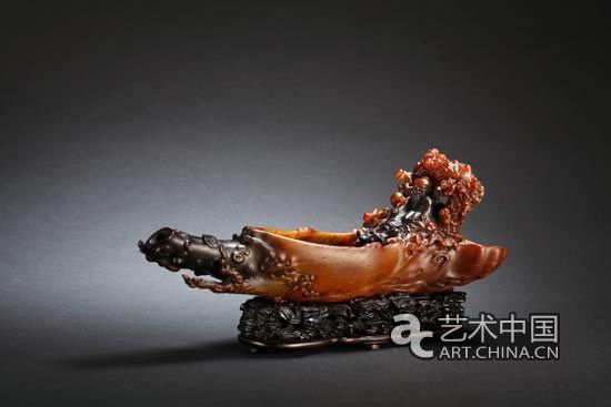翻閱古今文獻著錄可知,盡管犀角制品的使用歷史悠久,但隨著犀角資源的稀缺,其使用權(quán)一直被皇戚貴族控制著,早在商周、漢朝時期,犀角已是進貢皇帝的寶物,明朝時更是將其列為珍寶類藝術(shù)品,甚至被統(tǒng)治者用作等級制度的象征。近些年隨著犀牛被列為世界珍稀保護野生動物,犀角制品日益稀缺,加之收藏作為人們的一種高雅的消遣和投資理財活動已日趨普遍,業(yè)余收藏愛好者數(shù)量不斷擴大,其收藏的品種和門類也在不斷增多,包括角雕在內(nèi)的一些過去十分難得一見的高貴工藝美術(shù)品,現(xiàn)在終于有人敢于問津,故而愈顯犀角雕刻藝術(shù)的瑰麗之妍。本展覽中最引人關(guān)注的便是那些題材較為罕見的作品,如明代犀角雕百子圖杯便是一例。此器體量頗巨,精工細雕,敞口斂足,自然的弧度盡展犀角之原美,通體采用深淺浮雕、鏤雕技法雕刻出“百子嬉戲圖”,眾小兒在山林幽壑間嬉鬧追逐,其憨狀可掬,神情栩栩如生,此題材寄寓了人們對百子千孫的愿望,更體現(xiàn)了儒家詩禮傳家的傳統(tǒng)思想。而另一件犀角雕鮑天成作張騫泛槎器不僅雕工精美,亦有名家款識,保存至今仍品相完好,于北京故宮博物院及臺北故宮博物院均有同類器物收藏可作參照。除此之外,還有尤侃制犀角雙鷹杯、犀角雕梅花癭木題詩大杯、山水樓閣人物犀角杯、海水八怪犀角杯等等,營造出自然珍禽、詩書畫意、童稚雅趣等不同意境,令人不由稱奇。