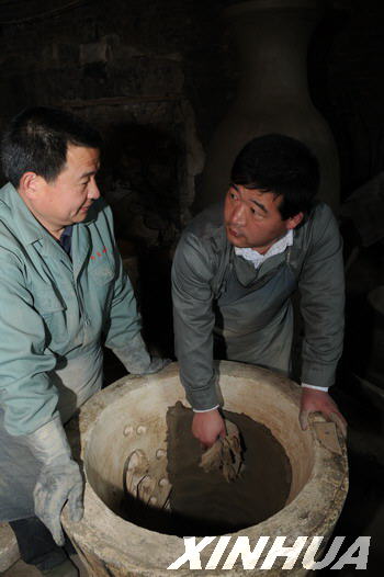 牛繼偉(右)正在與工人在拉泥,準備制作龍瓶。(閆盛霆 攝)
