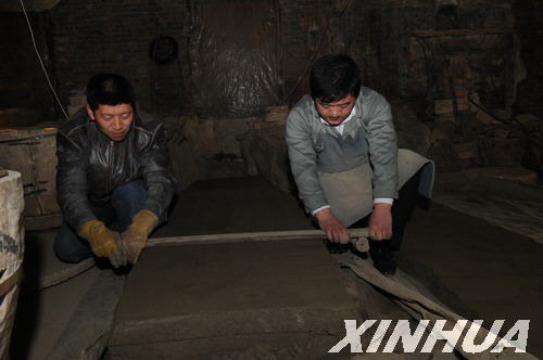 牛繼偉(右)正與工人在模具中制作泥坯。(閆盛霆 攝)