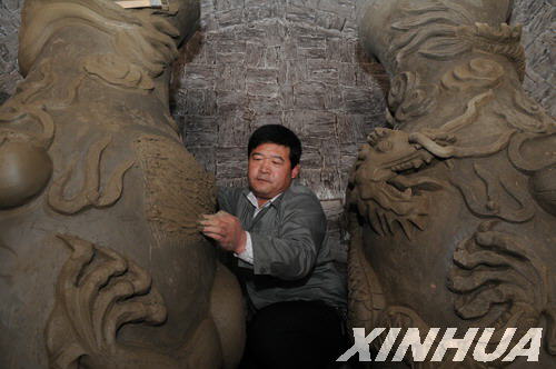 。ㄓ浾 閆盛霆 馬海波 王麗元)3月25日, 山東淄博辰浩雕塑藝術(shù)公司傳統(tǒng)陶瓷雕塑制作傳承人牛繼偉在陶瓷窯中為九龍瓶進行泥塑創(chuàng)作。