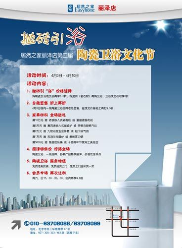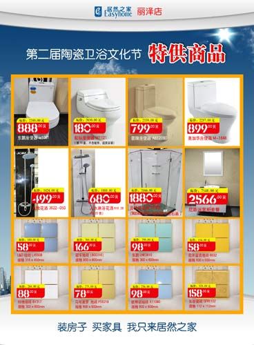4月是家庭裝修的季節(jié),為了保證京城消費者裝修質(zhì)量,居然之家最大旗艦店——麗澤店,將于4月3日至4月10日開展第二屆陶瓷衛(wèi)浴文化節(jié),讓消費者在家庭裝修過程中,得到真正的實惠。記者了解到,瓷磚、潔具和衛(wèi)浴五金等產(chǎn)品是是本次陶瓷衛(wèi)浴文化節(jié)的主打產(chǎn)品。