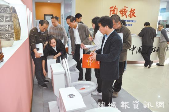 專(zhuān)家評(píng)委正在對(duì)參評(píng)的衛(wèi)浴產(chǎn)品進(jìn)行相關(guān)的功能測(cè)試(潘炳森 周偉軍 攝)