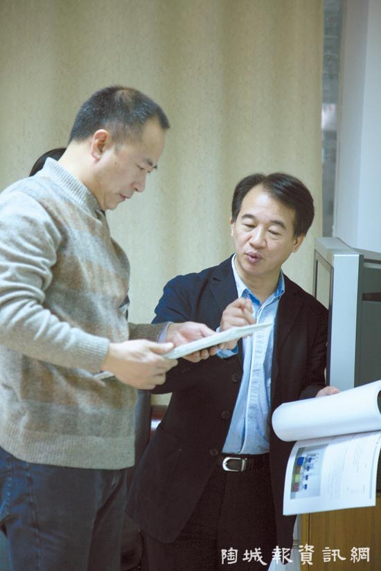 邱子良和徐平兩位評(píng)委正在對(duì)參評(píng)產(chǎn)品進(jìn)行打分(潘炳森 周偉軍 攝)