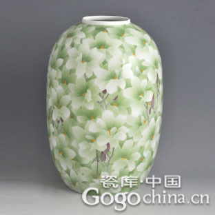 釉下金玉滿堂花瓶高30cm,采用釉下分水工藝,高白玉瓷材質(zhì),燈籠瓶型。由陶瓷藝術(shù)大師陳揚(yáng)龍親手繪制。此花瓶采用釉下五彩技藝,收口鼓腹短足,通體繪玉蘭滿花,罩施一層白釉,體形優(yōu)美勻稱,輕盈秀美而不失靈動。金玉滿堂花瓶以玉蘭花為題,利用花型的變化,重疊構(gòu)成疏密關(guān)系。通過色彩的濃淡深淺體現(xiàn)出眾多層次,使畫面滿而不塞,統(tǒng)一又有變化。滿花花瓣層次分明、清新欲滴,色澤鮮麗逼真、形態(tài)莊重典雅,花瓣格外生動逼真,襯托出釉下五彩瓷器特有的高雅品味。金玉滿堂花瓶以玉蘭為寓,寓意收藏者富有而有才干,滿花寓意財市滿室。一組共紅、紫、灰、綠四只,表現(xiàn)同一畫面又可用各種單一顏色表現(xiàn)出不同效果。