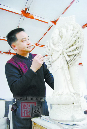 德化籍貫的陳仁海,目前已經(jīng)把家安在廈門,并把公司總部也設(shè)在廈門。記者走進(jìn)位于廈門思明區(qū)武裝部旁的陳仁海中國(guó)白展館,該館創(chuàng)辦于去年5月,占地近千平方米,集中展示陳仁海大師的作品。它是目前廈門最大的瓷器創(chuàng)意文化展示館,每天都有瓷器藝術(shù)愛(ài)好者、收藏者前來(lái)參觀,訂貨。在展館里,記者看到陳仁海的作品,既有反映民間吉祥文化的福、祿、壽、禧、財(cái)神;也有表現(xiàn)宗教文化和閩南文化特色的千手觀音、彌勒佛、媽祖系列;還有反映國(guó)家當(dāng)代重大事件、盛典、盛會(huì)題材作品,如汶川抗震救災(zāi)、北京奧運(yùn)會(huì)、新中國(guó)成立六十周年、上海世博會(huì)等。
