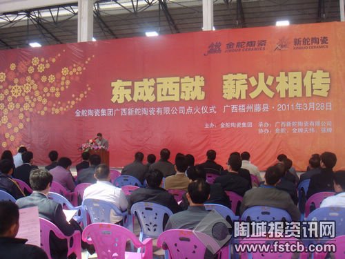 3月28日,艷陽高照,萬里無云。上午11點18分,“東成西就·薪火相傳”金舵企業(yè)廣西新舵陶瓷有限公司一期工程(1#窯爐、3#窯爐)點火儀式在廣西梧州藤縣隆重舉行。參加點火儀式活動的主要領(lǐng)導(dǎo)及嘉賓有:廣西藤縣縣委書記何棠先生、縣長黃東明先生、金舵企業(yè)羅董事長、廣西新舵陶瓷有限公司羅董事長、金舵企業(yè)生產(chǎn)總經(jīng)理唐總;另外還有來自藤縣縣委辦、政府辦、宣傳部、陶瓷辦以及政府各職能部門、金融系統(tǒng)、陶瓷行業(yè)兄弟企業(yè)、藤州鎮(zhèn)、塘步鎮(zhèn)等各級政府機(jī)關(guān)和企事業(yè)單位的嘉賓朋友200多人。點火慶典由廣西新舵陶瓷有限公司楊總親自主持。
